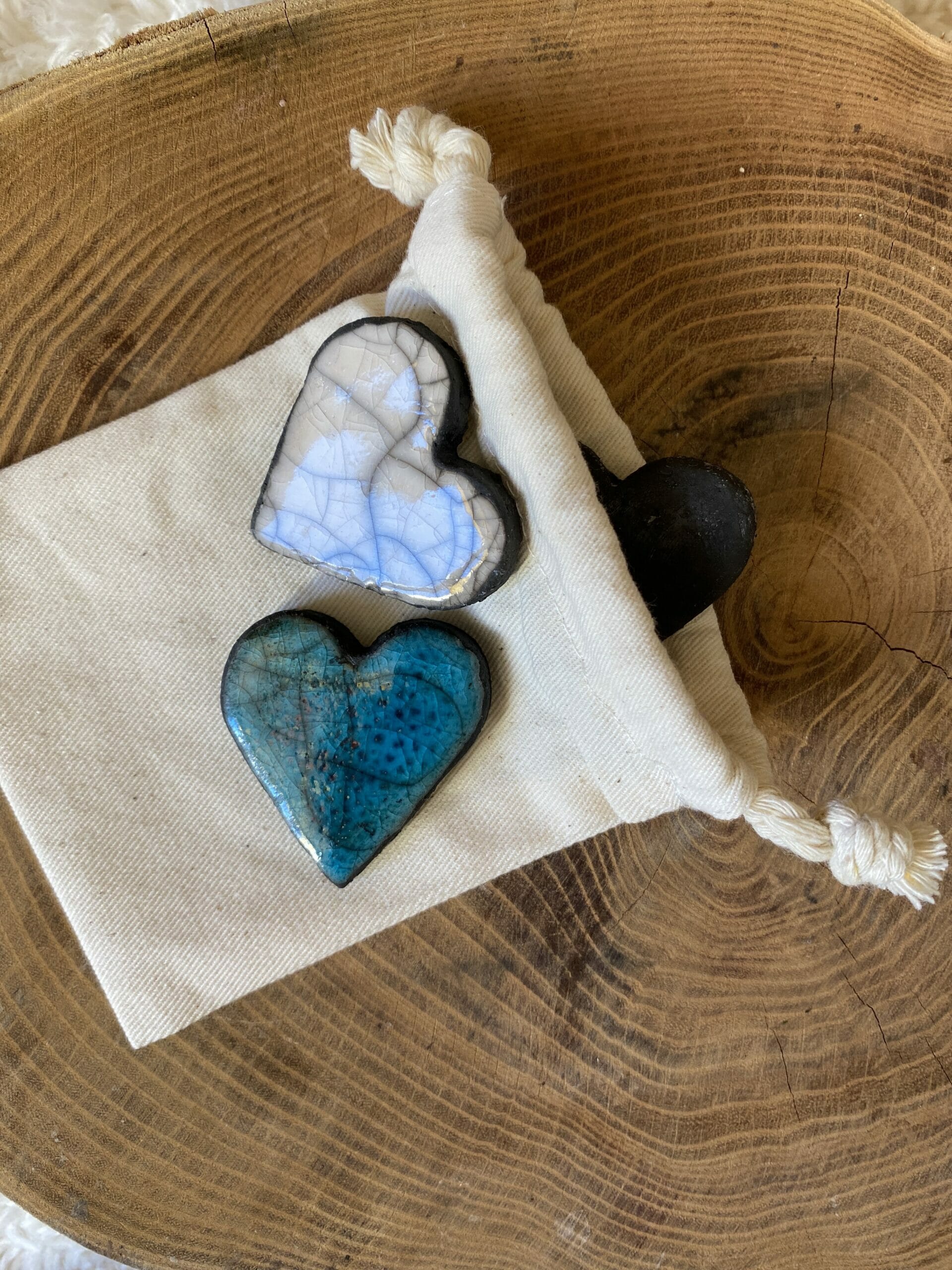 Le pochon Coeur – Sérénité est un pochon composé de 3 coeurs en céramique Raku. Ce pochon a été crée pour soutenir les Femmes dans leur besoin de sérénité, d’apaisement et de douceur.
